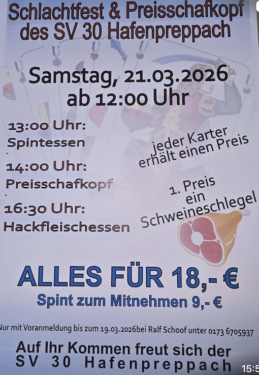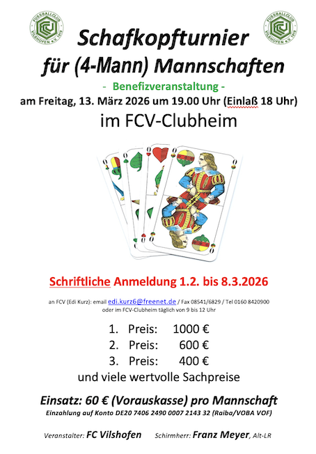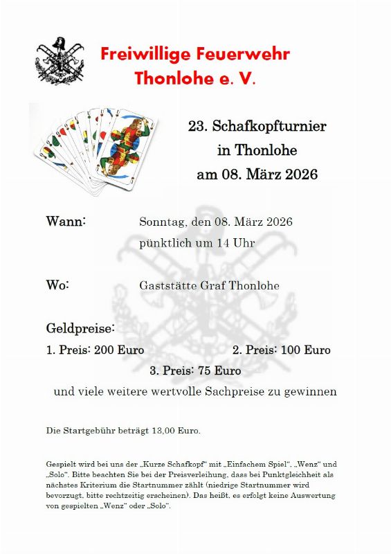 Gespielt wird langes Blatt. Jeder im Pluskonto erhält einen Essensgutschein im Wert von 25,00 €. Zusätzlich Geldpreise für den 1., 2. und 3. Platz.