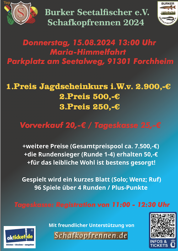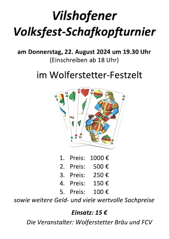 Hallo zusammen, wir veranstalten wieder unser Schafkopftunier. Gespielt wird Solo, Wenz und Farbwenz. Um Voranmeldung wird gebeten.