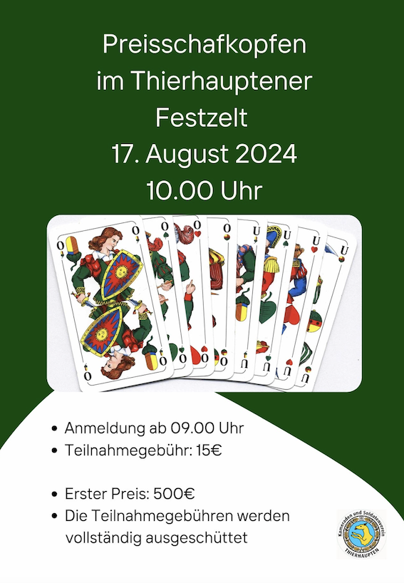 sowie weitere Geld- und Sachpreise. Für Speisen und Getränke ist bestens gesorgt. Ab 11.45 Mittagstisch. 0152 24845743 kurzes Blatt, mit Solo, Wenz und Geier Plus Punkte
