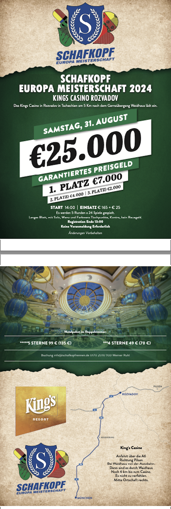 1. Preis von 150,- Euro ab 9 Tischen garantiert. Bis zu 8 Tischen 100,- Euro. Ab 14 Tischen für den 1. Preis 200,- Euro. Weitere Geldpreise absteigend. Anmeldung von 18.00 Uhr bis 18.45 Uhr. Später eintreffende Spieler können nur bis 19.00 Uhr zur Auflösung von 5er-Tischen angenommen werden. Für das leibliche Wohl ist bestens gesorgt.
